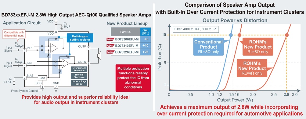 ROHM recently announced the AEC-Q100 qualified 2.8W output Class AB monaural speaker amplifiers the BD783xxEFJ-M series (BD78306EFJ-M, BD78310EFJ-M and BD78326EFJ-M) ideal for instrument clusters – used in vehicles equipped with autonomous driving and ADAS.