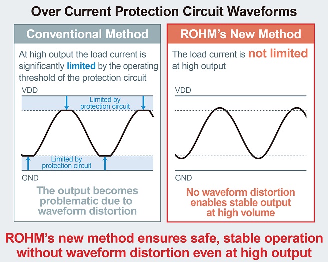 In contrast, ROHM’s new over current protection circuit eliminates the need to limit the output by preventing waveform distortion even at high output. This allows the BD783xxEFJ-M series to provide over current protection from output shorts which was difficult to achieve in the past in combination with high output (2.8W max. at 4Ω load and 10% distortion).