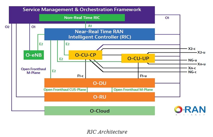An O-RAN Alliance defined network component that aligns with 3GPP Release 15 and beyond the RAN Intelligent Controller is cloud-native, and a central component of an open and virtualized RAN network. There are two types of RIC – a non-real-time and a near real-time – the main difference between them is the response time they take to effect changes in the RAN. The nRT RIC will turn around decisions between 10 ms and 1 sec. While the Non-RT RIC feeds data collected from RAN elements into Near-RT RIC and provides element management and reporting. By keeping the RIC open and standard interface fosters innovation and time to market.
