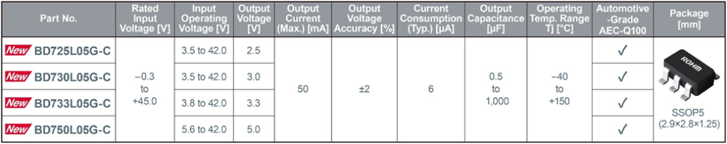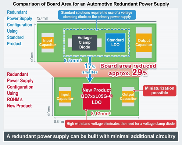 ROHM developed the availability of primary LDO regulators : BD7xxL05G-C series (BD725L05G-C, BD730L05G-C, BD733L05G-C, and BD750L05G-C) featuring a rated input voltage of 45V and 50mA output current optimized for redundant power supplies that are increasingly being used in automotive applications to improve the reliability of vehicle power systems.