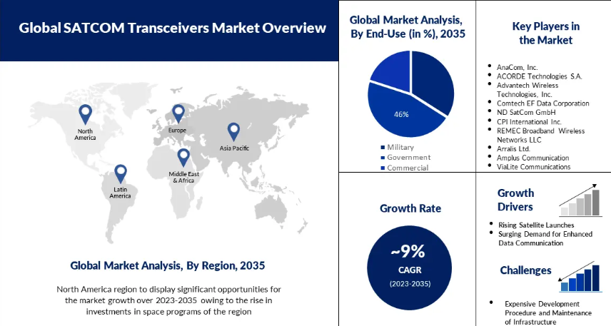 The SATCOM transceivers market size is anticipated to reach USD 65 billion by the end of the year 2035 by growing at a CAGR of 9% over the forecast period.