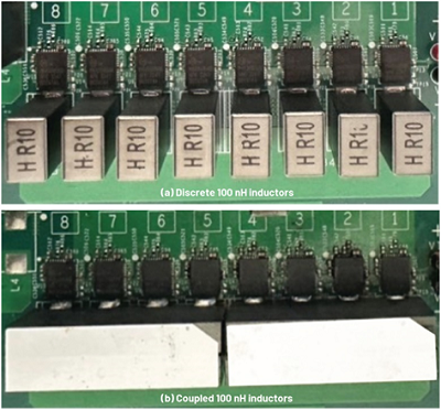 Many applications in data centers, artificial intelligence (AI), and communications use multiphase buck regulators with a 12 V input voltage. Figure 1(a) shows a conventional 8-phase buck with discrete inductors (DLs) placed in a row with an industry-typical 8.3 mm/phase pitch. The alternative solution on the very same layout is shown in Figure 1(b), where the discrete magnetics are replaced with two 4-phase coupled inductors (CLs).