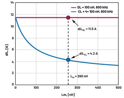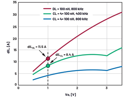 The corresponding current ripple is plotted in Figure 4, comparing the baseline design DL = 100 nH at Fs = 800 kHz with a proposed four phase CL = 4× 100 nH (Lm = 260 nH) with VIN = 12 V. Clearly, the CL solution can operate at Fs = 400 kHz instead of 800 kHz and still have a smaller current ripple as compared to DL = 100 nH at 800 kHz. The smaller peak to peak ripple implies that the rms of all circuit waveforms will be smaller as well, containing the conduction losses. The main efficiency improvement will come from the 2× reduction in Fs, which implies a big reduction in the switching losses, dead time loss in the body diodes of FETs, reverse recovery, gate drive losses, etc. Notice that the most significant efficiency improvement will appear at light load, where the AC losses are more visible. However, some losses, such as voltage and current overlap during the switching transitions, are proportional to the load current so the efficiency improvement will be visible at full load as well.