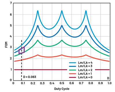 The 12 V to 1 V application corresponds to the duty cycle range around D~0.083. For the conservative Lm/Lk = 2.6, FOM > 2.5 in Figure 2 suggests that Fs in CL can be comfortably dropped by 2× to keep the current ripple down. This should provide significant efficiency improvement, as several losses proportional to the switching frequency will decrease.