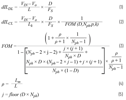 Alternatively, the coupled inductor with a leakage inductance, Lk, and the mutual inductance, Lm, has the current ripple that can be shown as Equation 2.1 The FOM is expressed in Equation 3, where Nph is the number of coupled phases, ρ is a coupling coefficient (Equation 4), and j is a running index that defines an applicable interval of the duty cycle (Equation 5).