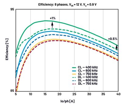The corresponding efficiency comparison at different switching frequencies is shown in Figure 7, with dashed curves for DL and solid curves for CL. At a high switching frequency, the current ripple is insignificant for both CL and DL and therefore efficiency performance is similar. But because CL has a significant current ripple advantage, lowering the Fs for CL leads to a large reduction in the overall losses without much of an impact from the increased current ripple. The efficiency of the DL solution also improves with lower Fs, but with an increasingly slower pace as the outsized current ripple makes the rms of the waveforms worse and causes a nonlinear increase in core loss and ACR loss. This results in a significant efficiency advantage of CL vs. DL: 1% at peak and 0.5% at full load. The related thermal performance is improved as well.