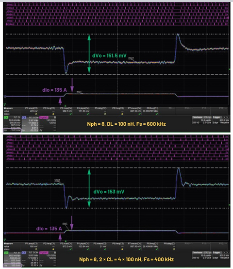 The transient performance of the four-phase buck is shown in Figure 6, comparing the waveforms of the 8-phase DL = 100 nH (600 kHz) and 2× CL = 4× 100 nH (400 kHz). The same current slew rate and the same output capacitance led to a similar transient performance, as expected. Potential reduction of the feedback bandwidth due to the reduction in the switching frequency for the CL is mitigated by multiphase topology as well as the fact that coupled phases effectively increase the phase margin of the feedback loop because transient change of the duty cycle in one phase results in all phase currents changing at the same time.