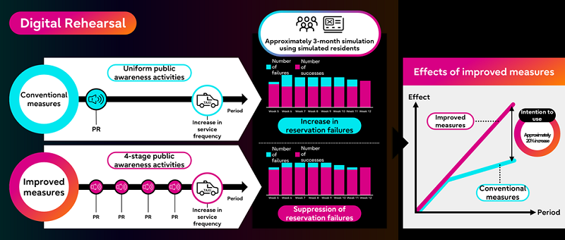 Using this simulation, the two parties optimized two key measures – “public awareness activities” and “service expansion by increasing the number of vehicles” – for the two psychological factors that were estimated to have a strong impact on usage intention: “awareness of the service” and ” perceived usefulness.” The simulation specifically revealed that strategically improving the timing and frequency of the distribution of promotional materials and the increase of the number of available taxis could significantly reduce reservation failures and boost usage intention by approximately 20%, leading to a greater service sustainability.