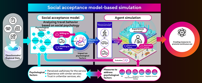 The “Social Acceptance Model,” developed by Nagoya University, provides a framework for understanding the psychological drivers behind transportation choices. By integrating this model with Fujitsu’s agent simulation digital rehearsal technology, which accurately reproduces and predicts human behavior on digital twins, the system can assess how various interventions – such as targeted advertising or other service improvements – will affect residents’ perceptions and consequently their willingness to use the service.