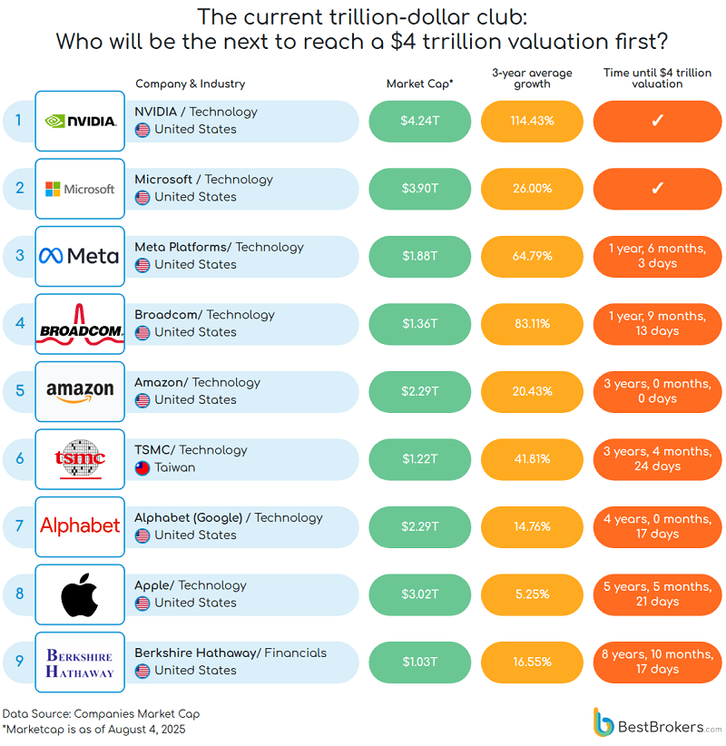 Inspired by this rapid ascent, our team at BestBrokers set out to forecast which of the current trillion-dollar giants might be the next to reach the major milestone of $4 trillion market capitalisation. We also tried to predict which companies with market caps still under $1 trillion are most likely to break into the trillion-dollar club next, using their market capitalisations as of August 4th, 2025, and extrapolating based on their historical average growth rates since 2022.