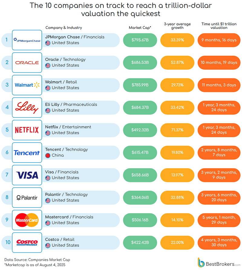 Oracle, JPMorgan, Netflix or Palantir – who will reach $1 trillion market cap first?