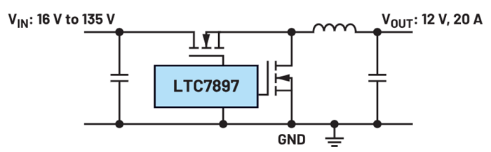 The two switches, S1 and S2, in Figure 1 are mainly responsible for the maximum possible input voltage range. However, the corresponding driver in a voltage converter IC must also be able to generate the high gate voltage required for the S1 switch. This voltage is the sum of the maximum supply voltage plus the threshold voltage required for the MOSFET. Thus, in addition to the MOSFET, the voltage converter IC must also be selected accordingly. Figure 2 shows the LTC7897 controller IC, which is designed for a supply voltage of up to 135 V (140 V abs max). The output voltage can also be very high when using this IC. It can be up to 135 V as long as it is lower than the input voltage.