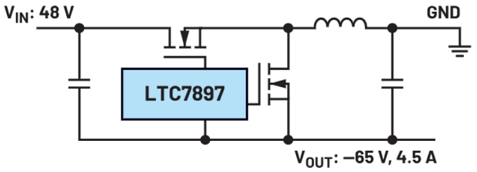 Figure 3 shows the LTC7897 in the inverting topology to convert from a 48 V supply voltage to a –65 V output voltage.