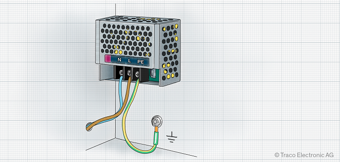 Confirm that the PSU includes a protective earth terminal for Class I systems and that its datasheet specifies compliance with Class I standards. The chassis must be grounded for wiring instructions in metallic enclosures.