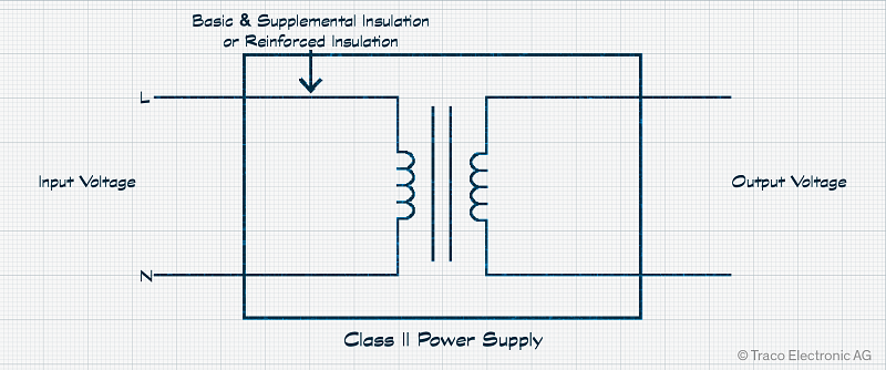 Class II power supplies take a different route to safety. Rather than grounding the enclosure, they eliminate the need for earth by using double or reinforced insulation. This method physically separates live circuitry from the user with multiple insulating barriers, enough that even a single failure won’t result in an electric shock.