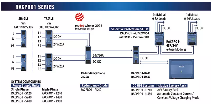 In factory automation, power supply units are no longer just passive energy sources; they are integral system components. They must combine energy efficiency, operational reliability, and diagnostic capability in a compact, maintenance-friendly design. With the RACPRO1 series, RECOM offers solutions that meet these requirements – modular, scalable, and suitable for both centralized and decentralized applications. When combined with e-fuses, redundancy diodes, and UPS systems, this results in a continuous power supply system that is fully compatible with DIN rails.