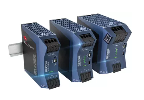 The RACPRO1 series from RECOM was specially developed for these requirements. It combines the highest levels of efficiency with a slim design and easy handling. Push-in connections at a 25° angle allow for tool-free mounting on the DIN rail. The compact design (from a width of 43mm) saves space in the control cabinet, while the optimized housing, with integrated chimney effect, ensures efficient convection cooling – even at ambient temperatures of up to 60°C, with no additional cooling required.