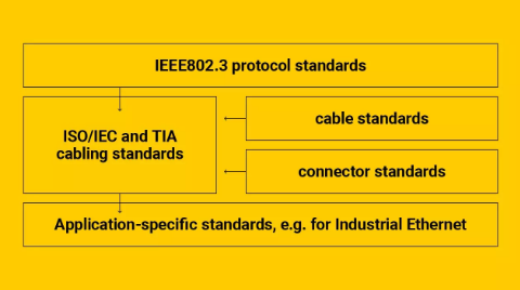 The cable infrastructure for copper-based or optical cabling is specified in the ISO/IEC 11801-x series of standards. The standards are internationally valid and are usually adopted unchanged in European and national standards. This series of standards serves as guidelines and manual for setting up standardised cabling systems. The various application areas, such as office buildings, data centres or industrial networks, have adapted sections that address the specific requirements in each case. With regard to suitable cables and connection technology, reference is made to the relevant cable and connector standards.
