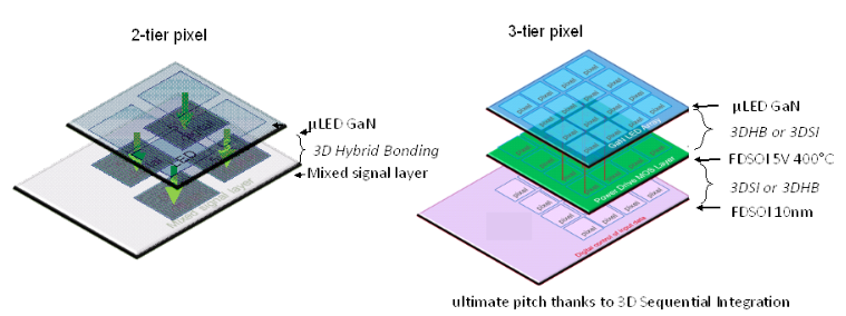 Concept of 3-tier µLED GaN pixel allowing an emissive array with strong pitch reduction thanks to 3DSI in combination with 3D hybrid bonding technology. CEA-Leti’s 400 °C CMOS process enables such top-tier integration without exceeding the thermal limits of the active circuitry below.