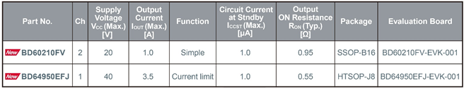 Both products are now in mass production (sample price: $1.5/unit, tax excluded). Online sales have also started, and they (BD60210FV, BD64950EFJ) can be purchased from online distributors such as DigiKey, MOUSER and Farnell. Evaluation boards (BD60210FV-EVK-001, BD64950EFJ-EVK-001) are also available to support application development and design.