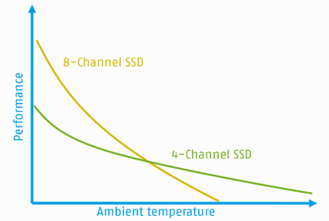 A similar trade-off appears in NAND flash architecture. While 8-channel NAND designs theoretically double bandwidth and IOPS compared to 4-channel SSDs, the increase in complexity and heat output often leads to diminishing returns (Figure 1).