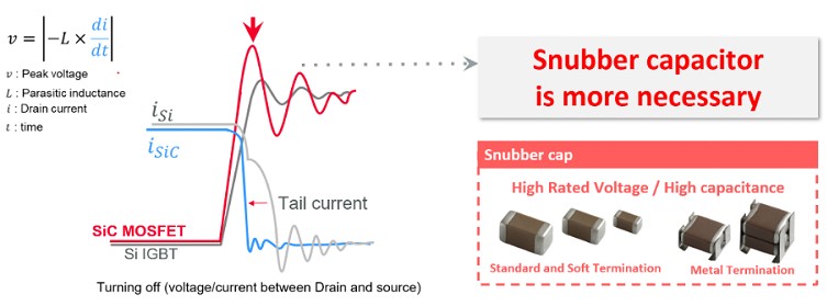 Snubber capacitors are essential in power electronics, especially where high-speed switching induces voltage overshoot and ringing. This is particularly critical during the turn-off transitions of MOSFETs or IGBTs. This issue is heightened in SiC and GaN power semiconductors, which exhibit greater surge voltages compared to traditional silicon IGBTs.
