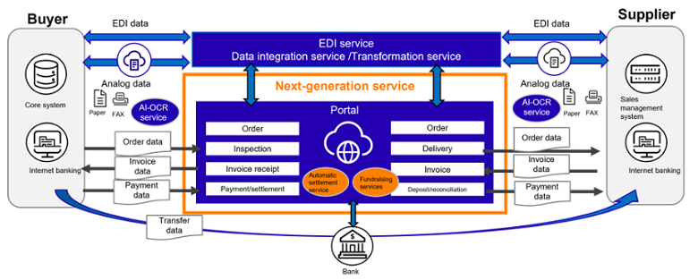 Based on this technology, Fujitsu and Mizuho Bank will promote the creation of next-generation services that fundamentally digitalize manual operations by integrating and linking disparate order data across different industries, beyond the distribution sector, on a single service platform. This will seamlessly connect order processing and payment operations that were previously fragmented between large enterprises and mid-sized and small and medium-sized enterprises. Furthermore, by addressing diverse funding needs through financing methods that utilize order data, the companies will respond to various customer requirements.