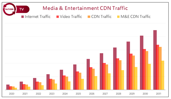 In our modeling, this functions as the Total Addressable Market (TAM) for CDNs. We have also broken out the Media & Entertainment (M&E) CDN TAM and SOM, illustrating how those components fit inside the whole. It is worth stressing that the size of YouTube, Netflix, and Prime Video distorts these views, as those contracts are very much not up for grabs by CDN vendors.