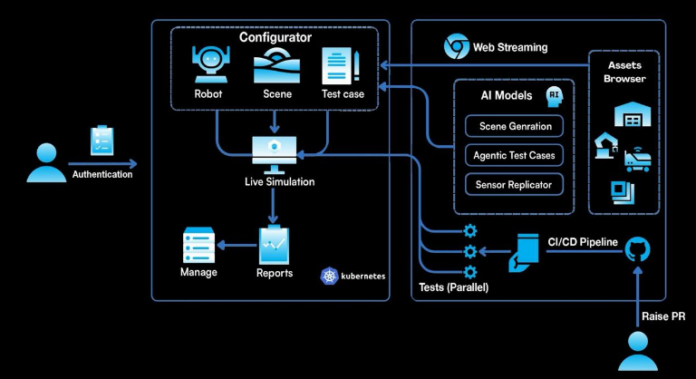 - Supports testing of humanoids AMRs and robotic systems within a unified virtual environment