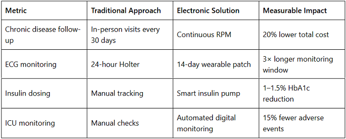 Healthcare providers increasingly measure value in cost per patient outcome, not just equipment price. Electronics that deliver measurable reductions in hospital stays (15–20%), readmissions (20%+), and adverse events (10–15%) will dominate procurement decisions.