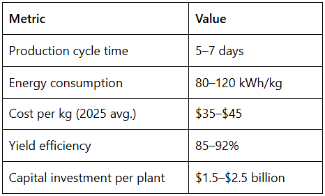 Energy efficiency improved by 18% between 2020 and 2025, reducing production costs by approximately $6–$8 per kg.