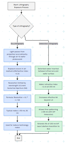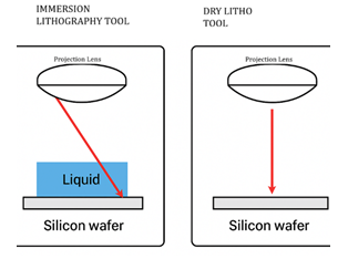 In dry lithography, light from the projection lens travels directly through air to expose the wafer photoresist, with resolution limited by the wavelength and numerical aperture of the system. Immersion lithography enhances this process by introducing a thin layer of liquid, typically deionized water, between the lens and wafer. This increases the effective numerical aperture, allowing finer patterning and improved resolution, making it suitable for advanced nodes