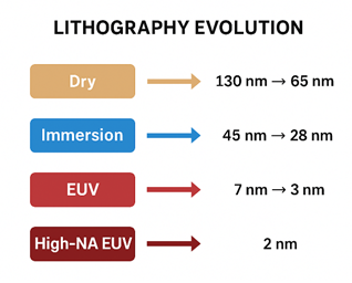 | EUV (High-NA) | 13.5 nm | Vacuum | 0.55 | ≤2 nm | Emerging |