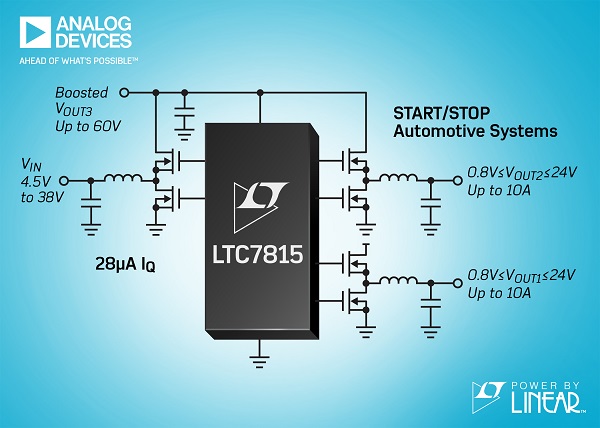 Analog Devices announces the Power by Linear™ LTC7815, a high frequency (up to 2.25MHz) triple output (buck, buck, boost), synchronous DC/DC controller that maintains all output voltages in regulation during automotive cold crank conditions. A 12V automotive battery can droop to less than 4 volts during engine restart or cold crank, causing reset of infotainment systems and other electronics that operate...
