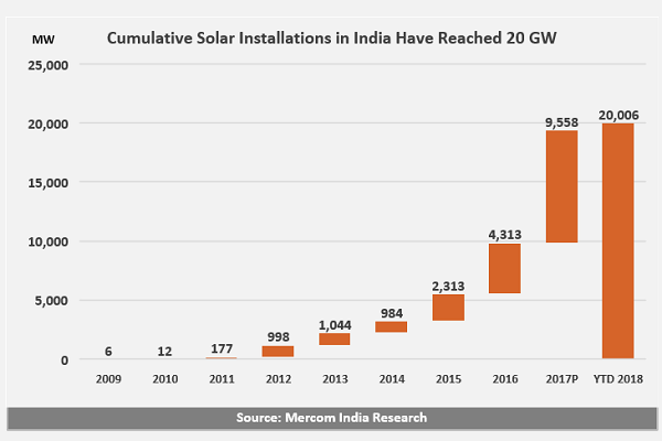 India Reaches 20 GW in Cumulative Installed Solar Capacity
